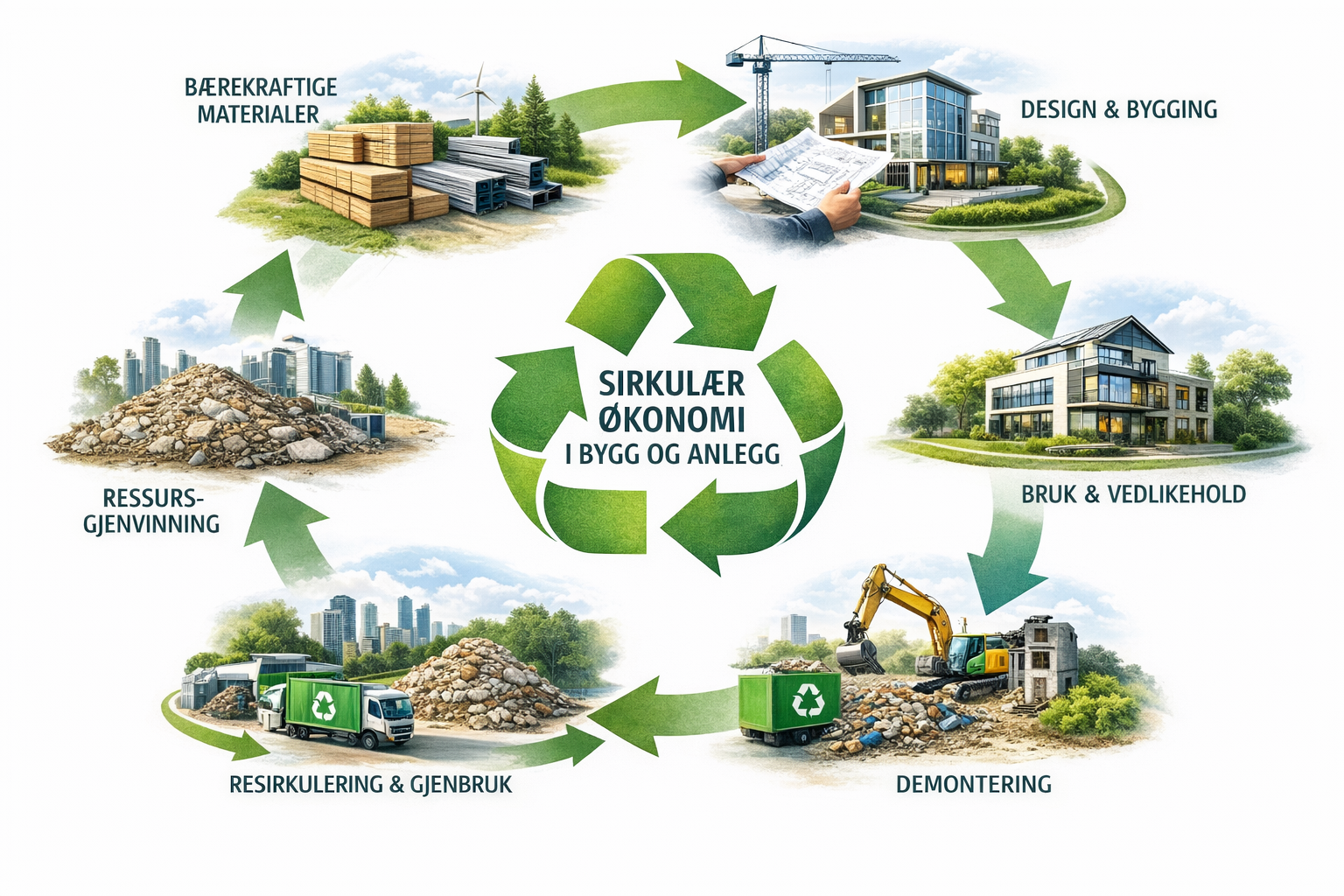 Vi samarbeider strategisk med Sirken (sirken.no) for å fremme sirkulær økonomi i byggebransjen. I 2024 gjennomførte vi fem pilotprosjekter som anvendte sirkulære prinsipper, noe som resulterte i en estimert reduksjon på 22 tonn avfall sammenlignet med tradisjonelle metoder.